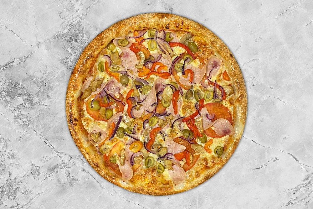 Ветчина из цыпленка, шампиньоны, помидоры, перец болгарский, лук красный, оливки, моцарелла, соус томатный, индийские приправы, зелень микс.