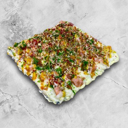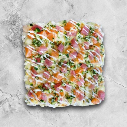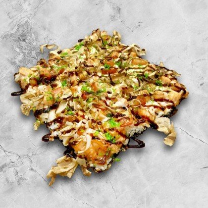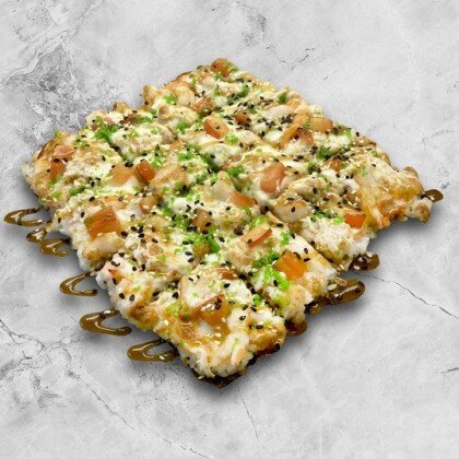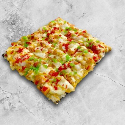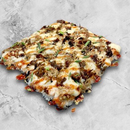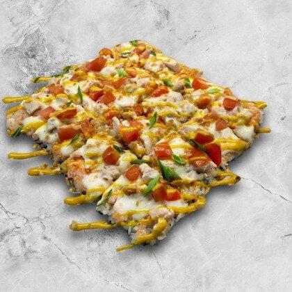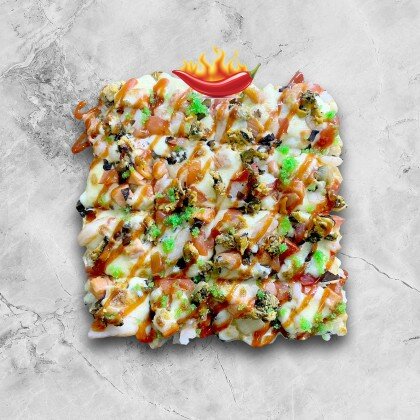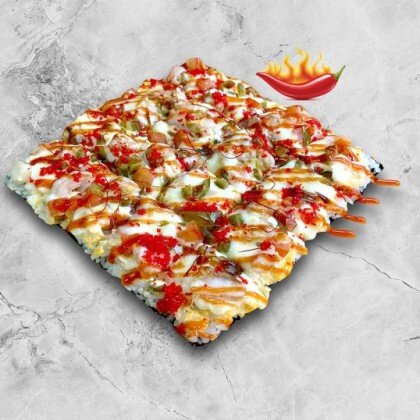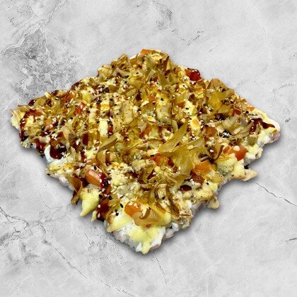 Лист нори, рис, копченая курица, помидор, перец, сыр моцарелла, лук зеленый, кунжут, соус спайси (содержит чеснок), соус терияки.