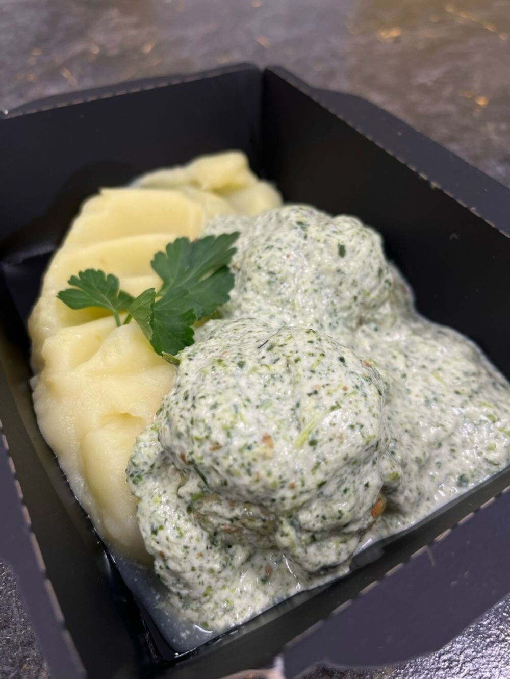 Ежики из цыпленка с брокколи под сливочно-шпинатным соусом с пюре