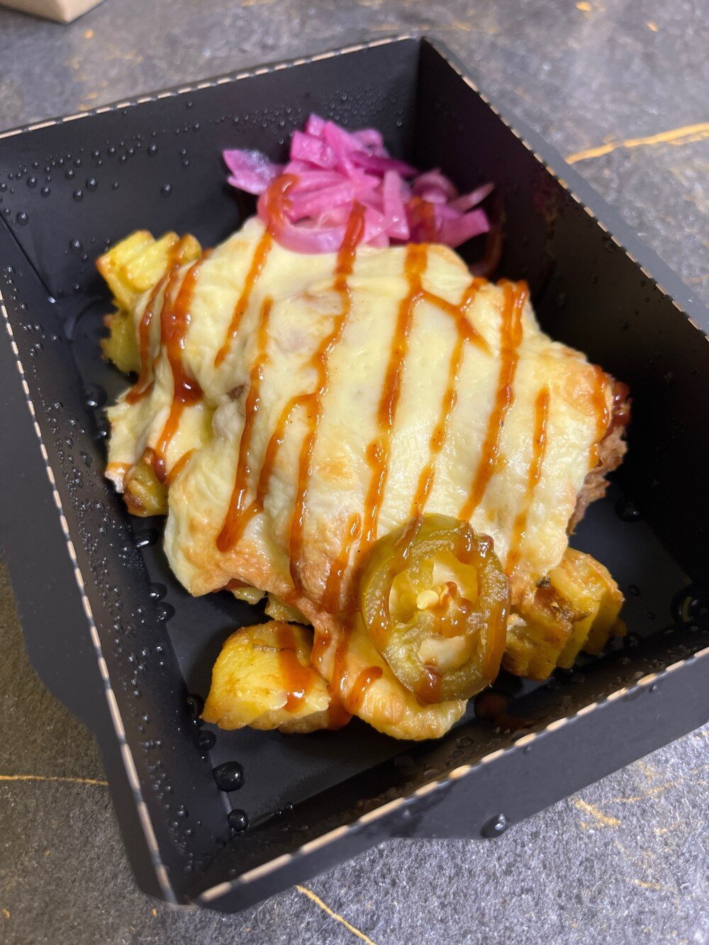 Куриная котлета под двойным сыром с халапеньо с макаронами