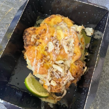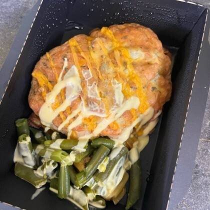 Филе трески с рисом и овощами под сырной шапочкой с луком фри