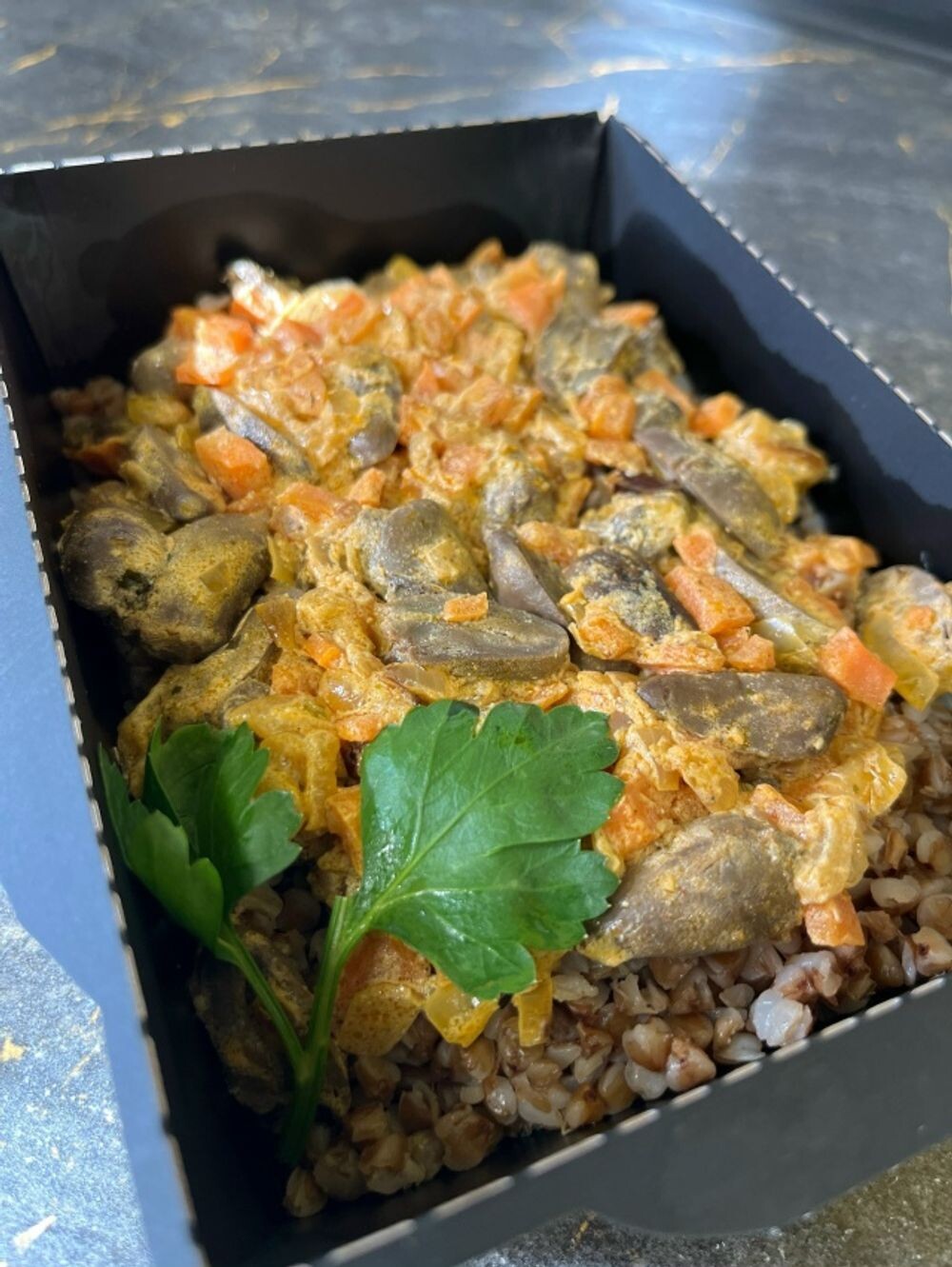 Куриные сердечки в сметанно-томатном соусе с рисом