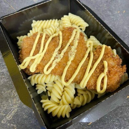 Куриное филе с грибами под сырной шапочкой с макаронами