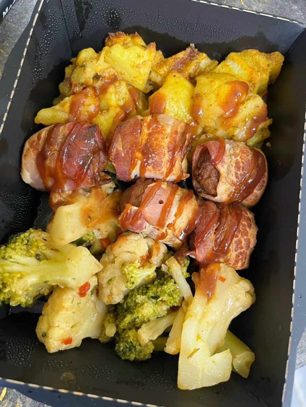 Куриные фрикадельки в беконе с печеным картофелем и овощами
