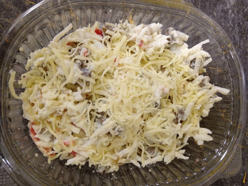 Салат с крабовыми палочками ,грибами ,луком и яйцом