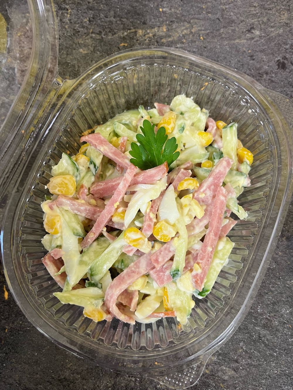 Копченая колбаса ,огурец,яйцо,кукуруза