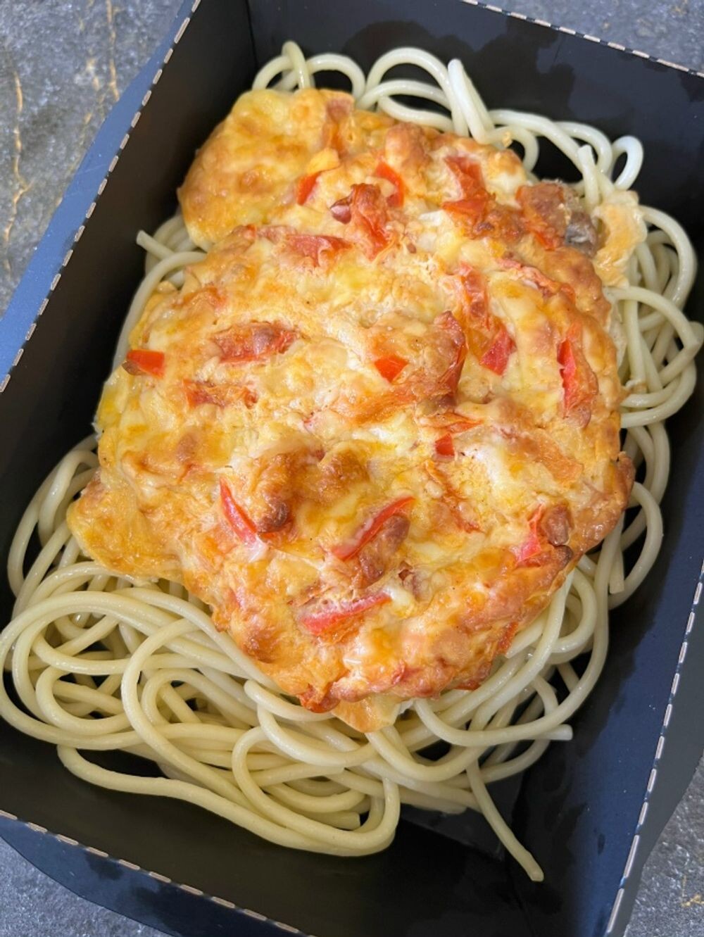 Куриное филе под овощной шапочкой с паприкой со спагетти