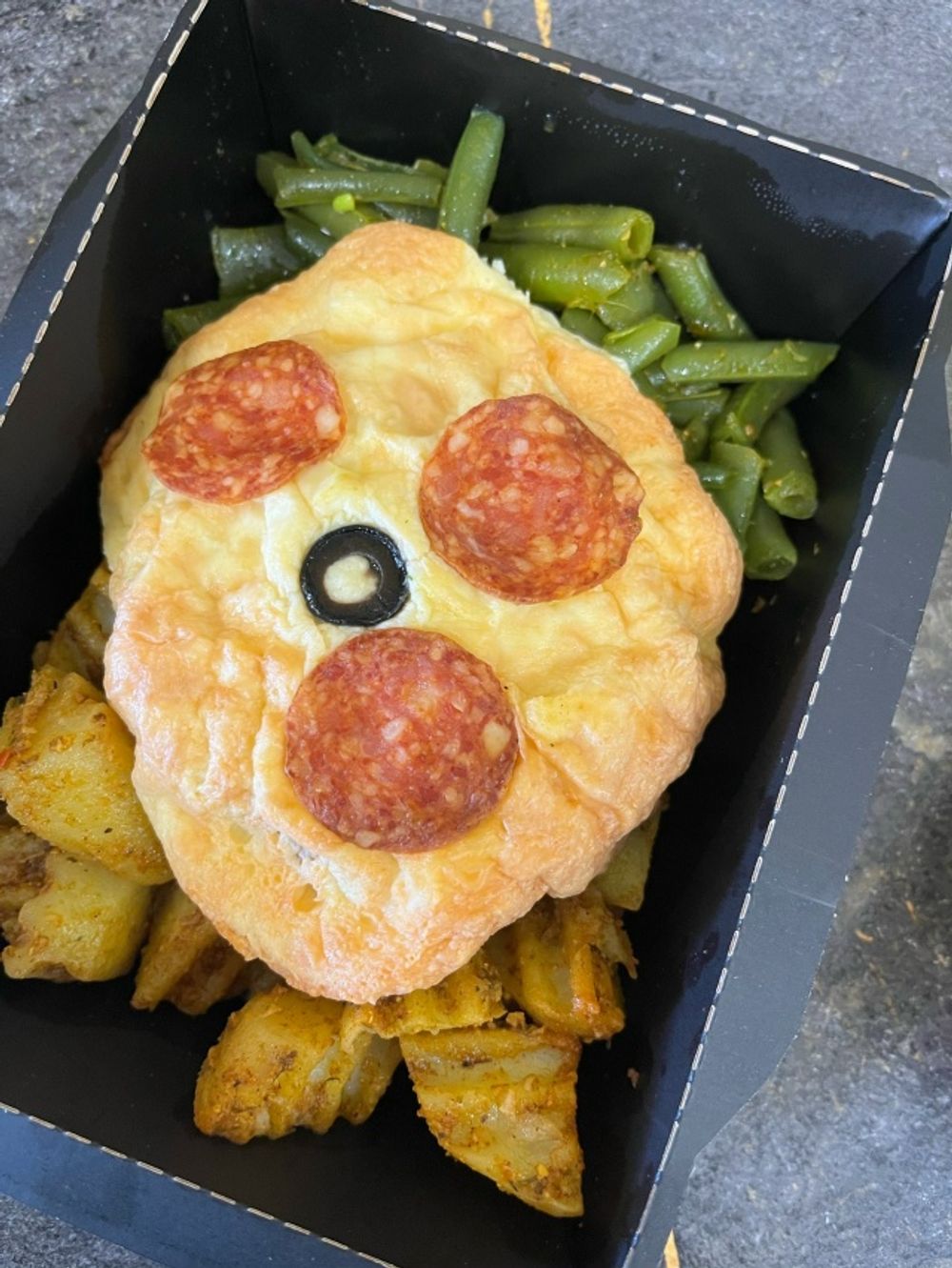 Мясная котлета под сырной шапочкой с печеным картофелем и фасолью с острыми колбасками чоризо