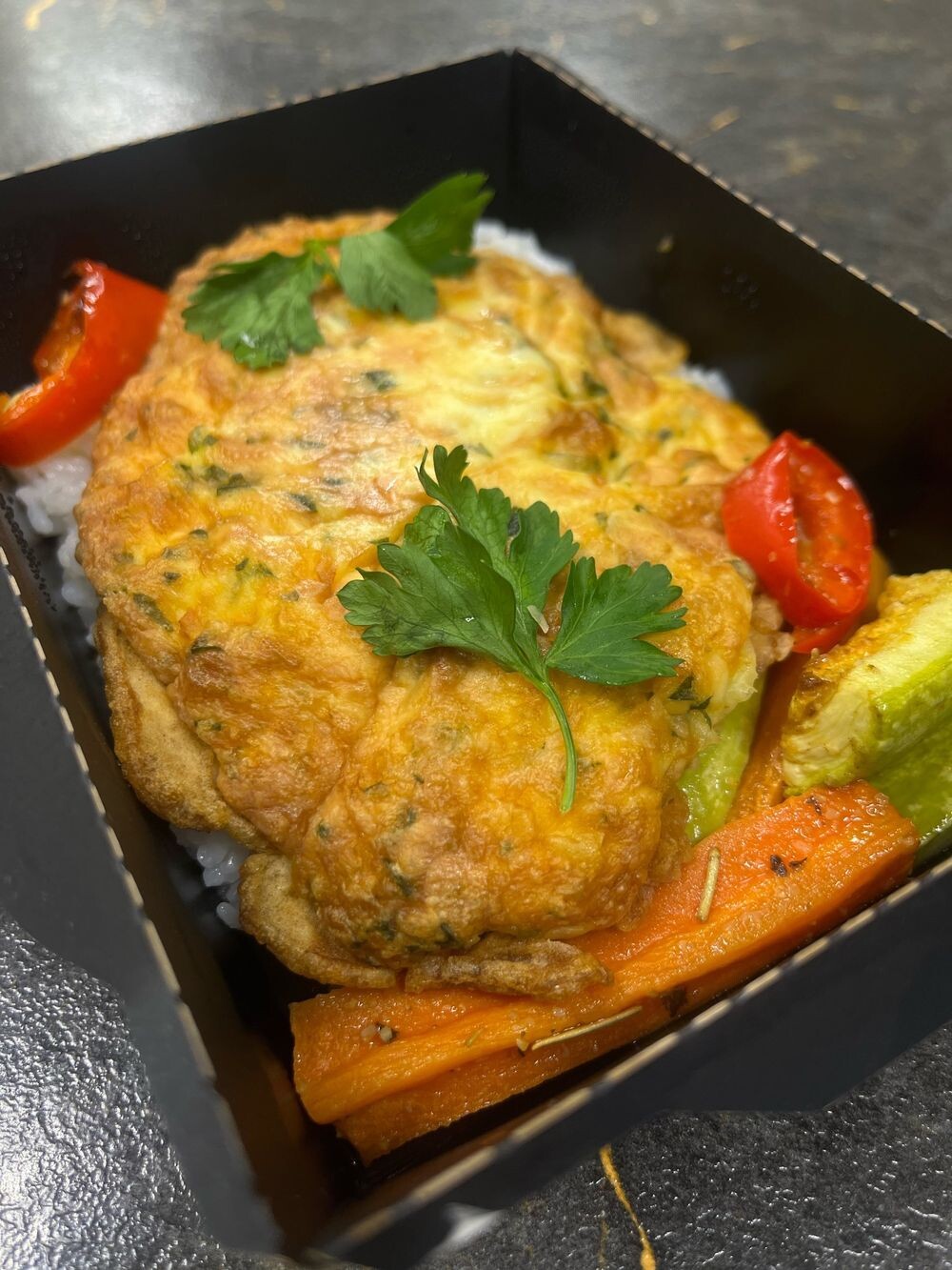 Куриное филе под овощной шапочкой с паприкой с рисом