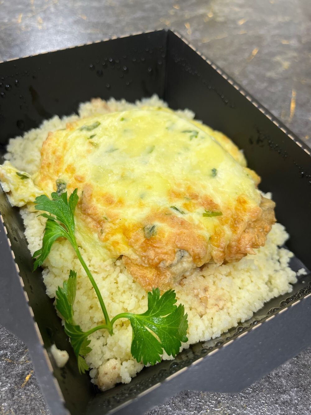Судак запеченный под сырной шапочкой с кус-кусом с ореховым соусом
