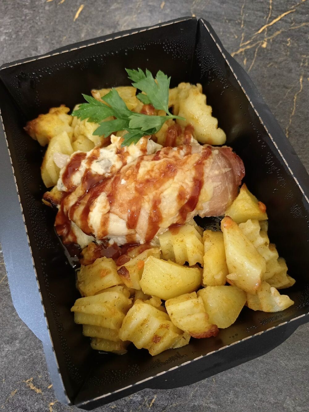 Куриное филе с сыром и грибами запеченное в беконе с печеным картофелем