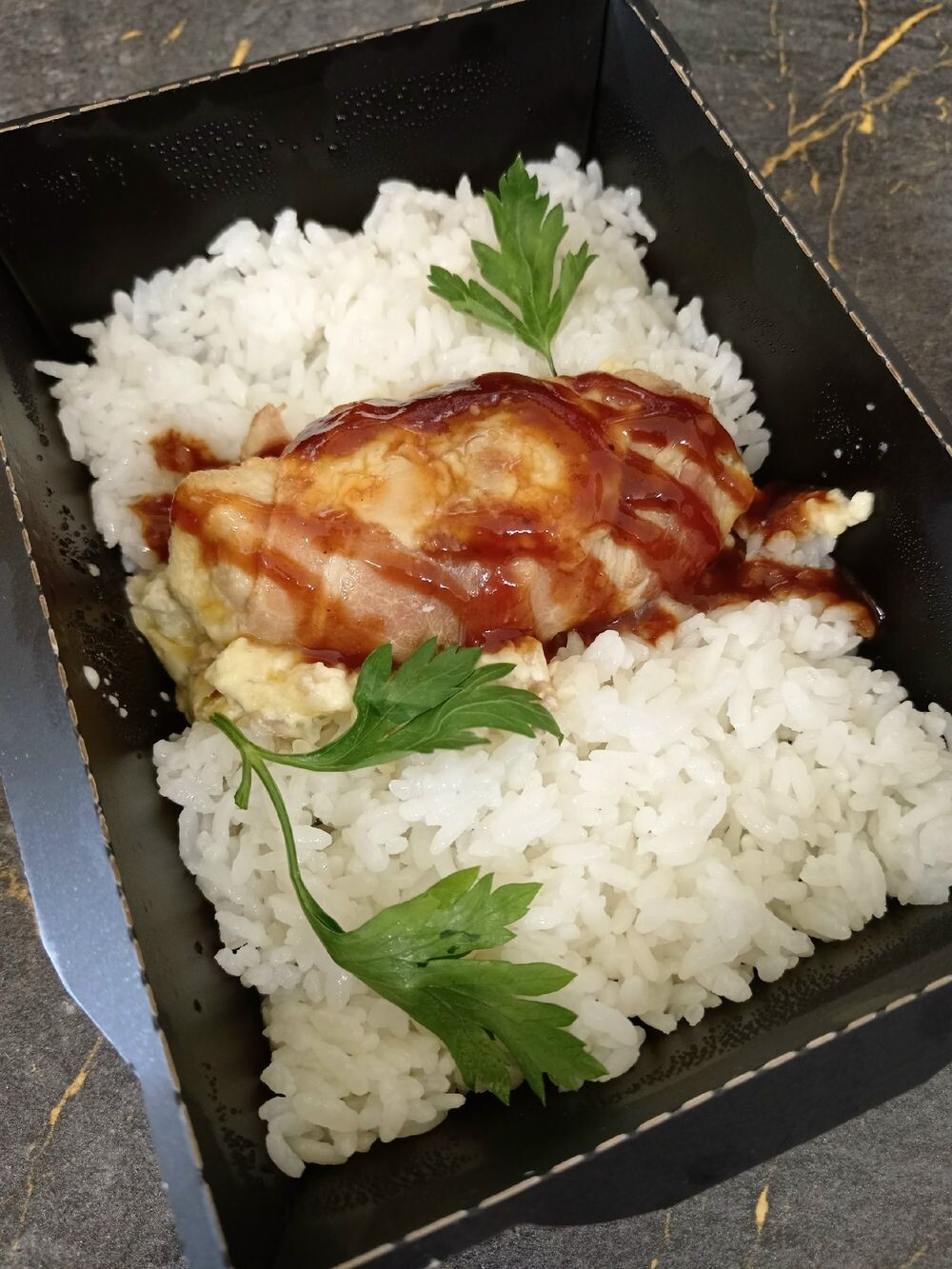 Куриное филе с сыром и грибами запеченное в беконе с рисом