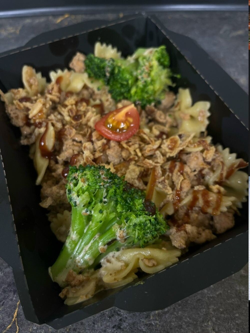 Фарфалле с фаршем барбекю и подкопченной брокколи