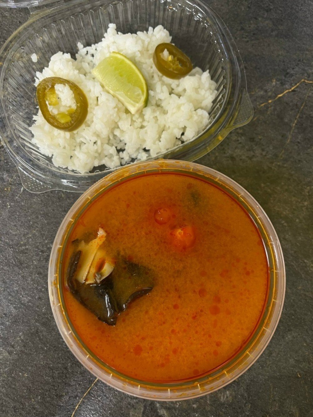 Бульон том ям, креветки, кальмары, микс грибов, черри.