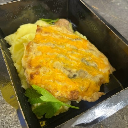 Свинина с грибами под сырной шапочкой с сырным соусом