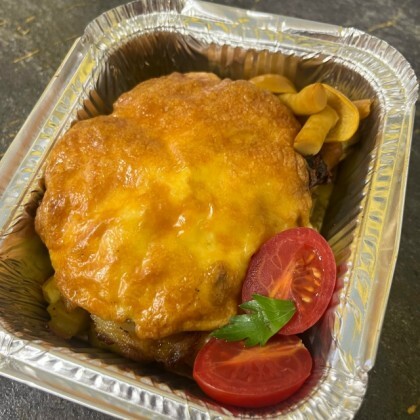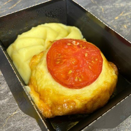 Домашняя котлета под сырной шапочкой с помидором и пюре