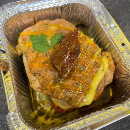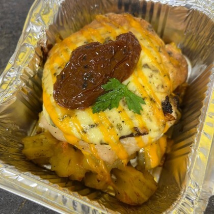 Запеченное куриное филе под сырной шапочкой с прованскими травами ,вяленным томатом с печеным картофелем.