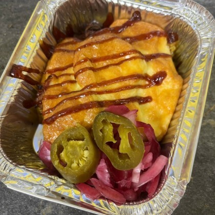Рваная свинина по-французски с печеным картофелем ,маринованным луком и перчиком халапеньо