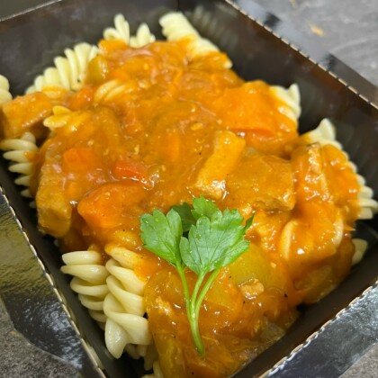 Мясной гуляш с макаронами