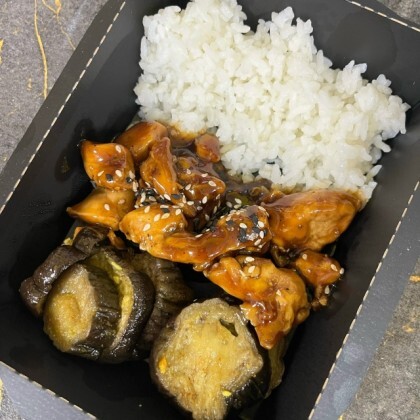 Куриная грудка в соусе терияки с печеными баклажанами и рисом