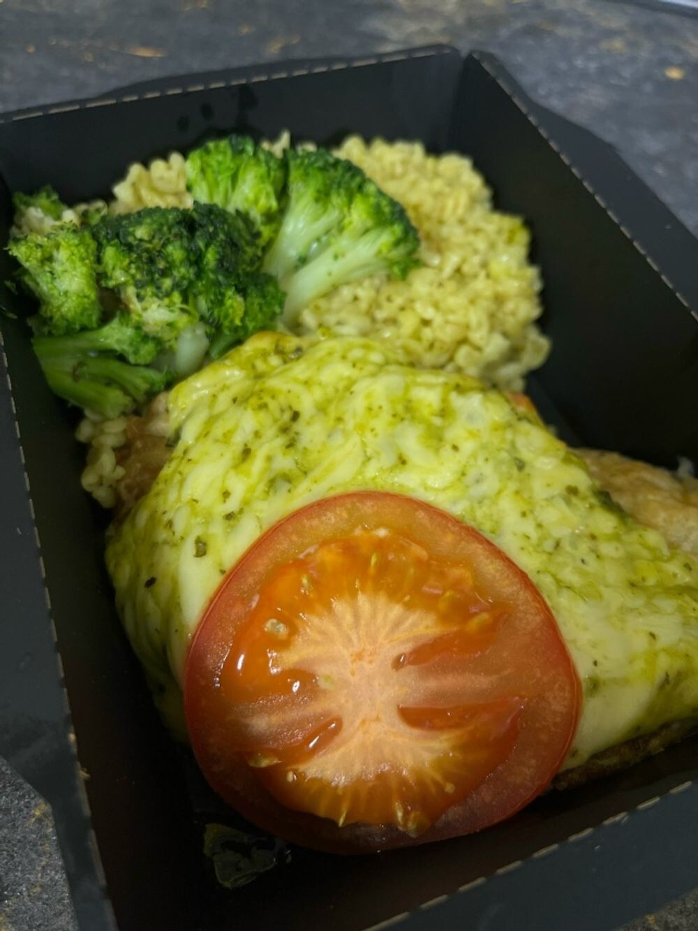 Треска под сыром моцарелла и соусом песто с гарниром из булгура и брокколи.