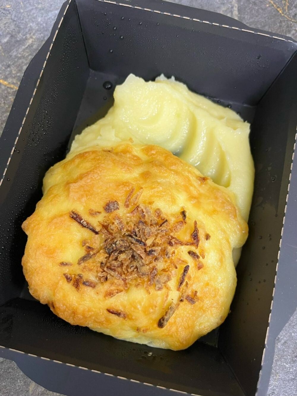 Запеченный судак под сырной шапочкой с луком фри с пюре