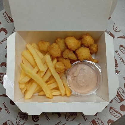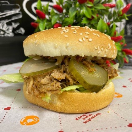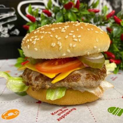 Булочка, куриная котлета, сыр чеддер, помидор, салат айсберг, соус сырный, соус бургер.