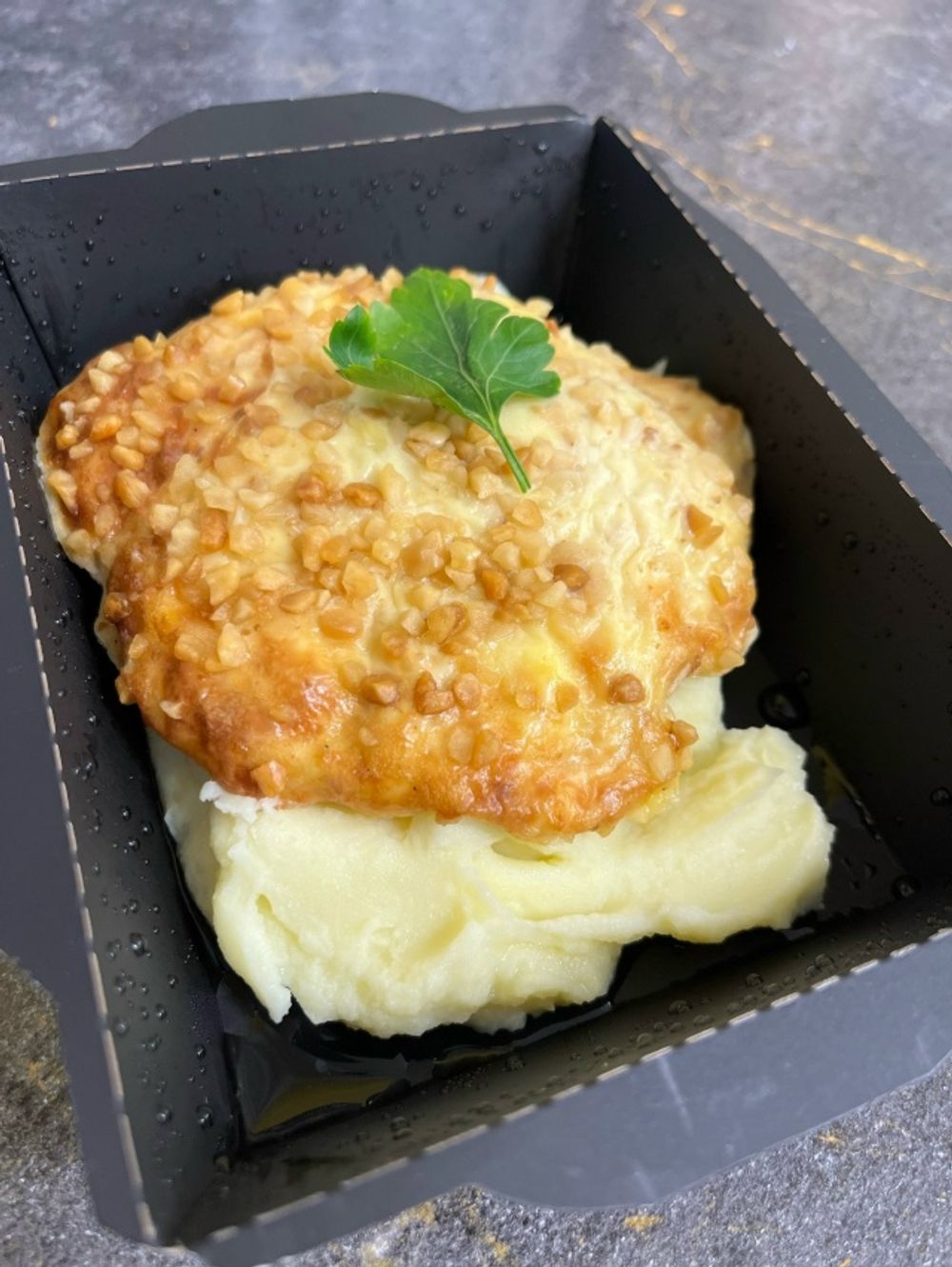 Куриное филе под сырно-ореховой шапочкой с пюре